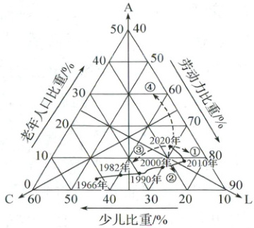 (模型构建(2025 江苏张家港月考)人口年龄结构三角图适合刻画国家人口结构的演变路径。下图描述了 1966—2020 年我国人口年龄结构演变路径。据此完成 12~13 题。