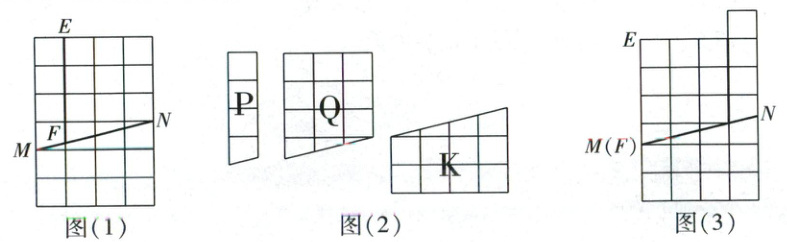 现有一块$4×6$的巧克力板,每小块巧克力是边长为1的正方形,点$M$,$N$,$E$均为小正方形的顶点,淇淇先沿$MN$斜向切开,再从点$E$处向下切开(如图(1)),与$MN$交于点$F$,把巧克力分成$P$,$Q$,$K$三块(如图(2)),再将这三块重新组合起来(如图(3)),淇淇惊喜地发现巧克力居然多出一块.于是淇淇猜想按照这样不停地操作下去,就有吃不完的巧克力了.