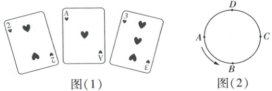 有三张扑克牌,如图(1)所示.将它们洗匀后背面朝上放在桌上,$A$,$B$,$C$,$D$是圆的四等分点,如图(2).现通过抽取扑克牌的办法玩跑圈游戏,规则如下:若抽取扑克牌牌面上的数字是几,就从图(2)中点$A$的位置沿圆弧逆时针方向连续跑过几个$\frac{1}{4}$圆,第二次跑圈从第一次跑圈结束后的位置开始,按照规则继续进行. ($A$代表数字1)