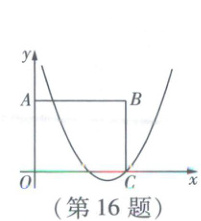 16. 如图,在平面直角坐标系中,矩形OABC的顶点O与原点重合,顶点A,C分别在y轴与x轴上,点B的坐标为$(5,4)$. 抛物线$y = \frac{1}{2}x^{2} - bx + c$经过点$(m,n)$和$(m + 2,n)$,当y随x的增大而增大时,x的取值范围是$x > 2m - 2$. 若抛物线与矩形的边有两个交点,则c的取值范围是
