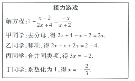 新情境 接力游戏 在数学课上,老师出了一道题,随机选择一组同学进行合作完成“接力游戏”. 规则如下:每位同学可以完成解分式方程的一步,即前一位同学完成一步后,后一位同学接着前一位同学的步骤进行下一步运算.