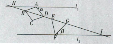 如图,设直线$BD$分别交$l_{1}$,$l_{2}$于点$H$,$G$,$\because \angle ADE = 146^{\circ}$,$\therefore \angle ADB = 180^{\circ} - \angle ADE = 34^{\circ}.\because \angle \alpha = \angle ADB + \angle AHD$,$\therefore \angle AHD = \angle \alpha - \angle ADB = 50^{\circ} - 34^{\circ} = 16^{\circ}.\because l_{1} // l_{2}$,$\therefore \angle GIF = \angle AHD = 16^{\circ}.\because \angle EGF = \angle \beta + \angle GIF$,$\therefore \angle \beta = \angle EGF - \angle GIF = 60^{\circ} - 16^{\circ} = 44^{\circ}$.