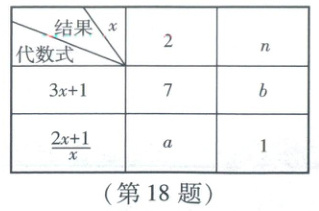 【解析】当$x = 2$时,$\frac{2x + 1}{x} = \frac{2 × 2 + 1}{2} = \frac{5}{2}$,即$a = \frac{5}{2}$;当$x = n$时,$\frac{2x + 1}{x} = \frac{2n + 1}{n} = 1$,$\therefore n = -1$.当$x = -1$时,$3x + 1 = 3 × (-1) + 1 = -2$,即$b = -2$.
