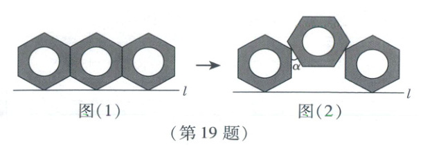 19. 将三个相同的六角形螺母并排摆放在桌面上,其俯视图如图(1),正六边形边长为2且各有一个顶点在直线$l$上.两侧螺母不动,把中间螺母抽出并重新摆放后,其俯视图如图(2),其中,中间正六边形的一边与直线$l$平行,有两边分别经过两侧正六边形的一个顶点.则图(2)中,