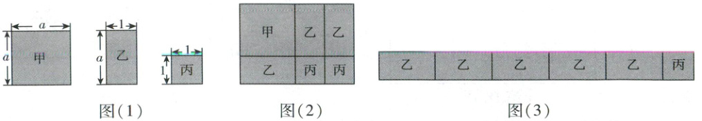 现有甲、乙、丙三种矩形卡片各若干张,卡片的边长如图(1)所示($a > 1$).某同学分别用6张卡片拼出了两个矩形(不重叠无缝隙),如图(2)和图(3),其面积分别为$S_{1},S_{2}$.