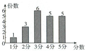 (1)由条形统计图可知,客户所评分数按从小到大排列后,第$10$,$11$个数据分别是$3$分,$4$分,$\therefore$客户所评分数的中位数为$\frac{3 + 4}{2} = 3.5$(分). (2分)客户所评分数的平均数为$(1 × 1 + 2 × 3 + 3 × 6 + 4 × 5 + 5 × 5) ÷ 20 = 3.5$(分). (3分)$\because$客户所评分数的平均数和中位数都不低于$3.5$分,$\therefore$该部门不需要整改. (4分)