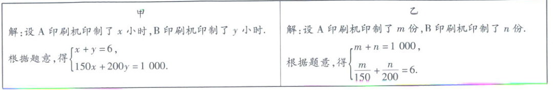 7. 某份资料计划印制1000份,该任务由A,B两台印刷机先后接力完成。已知A印刷机的印制速度为150份/时,B印刷机的印制速度为200份/时。两台印刷机完成该任务共需6小时。甲、乙两人所列的方程组如图所示,则下列判断正确的是(