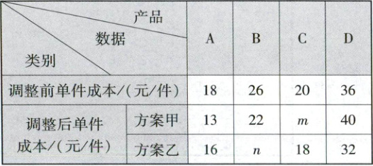 某工厂生产A,B,C,D四种产品.为提升产品的竞争力,该工厂计划对部分种类的产品优化生产流程,降低成本;对其他种类的产品增加研发投入,提升品质.经研究,该工厂做出了甲、乙两种调整方案,这两种方案将对四种产品的成本产生不同的影响.