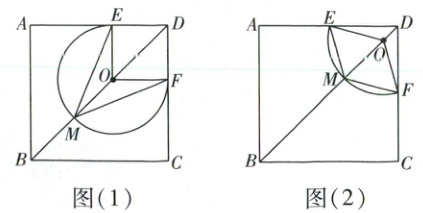 如图(1),图(2),正方形ABCD的边长为5.扇形OEF所在圆的圆心O在对角线BD上,且不与点D重合,半径OE=2,点E,F分别在边AD,CD上,DE=DF(DE≥2),扇形OEF的弧交线段OB于点M,记为$\overset{\frown}{EMF}$.