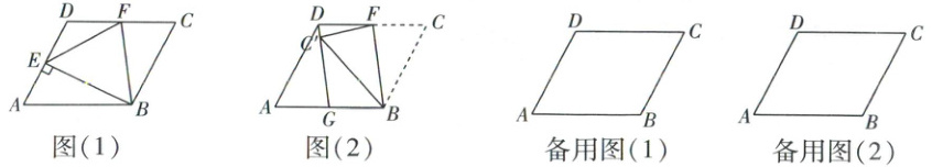 数学活动课上,老师出示了一个问题:如图(1),在$□ ABCD$中,$BE \perp AD$,垂足为E,F为CD的中点,连接EF,BF。