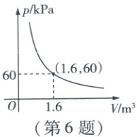 6 C 根据题意可设$p = \frac{k}{V}$,将(1.6,60)代入,可得$k = 1.6 × 60 = 96$,$\therefore p = \frac{96}{V}$.当$p = 120$时,$V = \frac{96}{120} = \frac{4}{5}$.$\because$为了安全,$p \leq 120$,$\therefore V \geq \frac{4}{5}$(提示:可结合题图中的反比例函数图象进行判断).