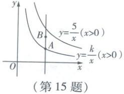 15. 新课标 开放性试题 如图,点A(2,1)在反比例函数$y = \frac{k}{x}(x > 0)$的图象上,点B在反比例函数$y = \frac{k}{x}(x > 0)$和$y = \frac{5}{x}(x > 0)$的图象之间,BA⊥x轴,写出一个符合条件的点B的坐标: