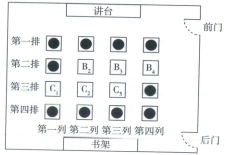 如图,16个小方框代表16把椅子,其中黑色圆点表示已有人入座,小李和小王随机入座,根据要求,小李需要坐第二排,小王需要坐第三排,两人选择座位的可能性相同。