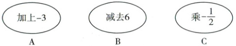 数学活动课上,刘老师让同学们做一个数学游戏,规则如下:每次游戏都涉及A,B,C三种运算,A,B,C代表的运算如图所示。每一种运算是在上一步运算结束后进行的一步运算。运算过程中自动添加必要的括号。例如:对数1按A→B→C的顺序运算,列式为[1 + (-3) - 6]×(-$\frac{1}{2}$)。