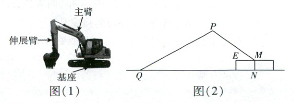 如图(1)是某型号挖掘机,该挖掘机是由基座、主臂和伸展臂构成。如图(2)是其在某种工作状态下的侧面结构示意图。已知EM//QN,基座高度MN为1 m,主臂MP的长为5 m,测得主臂伸展角∠PME = 37°。