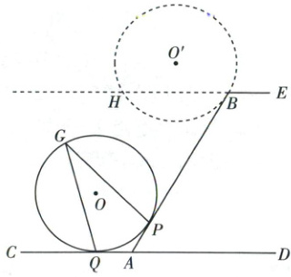 如图,斜坡$AB$与地面$CD$的夹角$\angle BAD = 60^{\circ}$,斜坡顶端$BE// CD$。半径为2的$\odot O$与$AB$相切于点$P$,与$CD$相切于点$Q$,$\odot O$上固定的一点$G$恰在$\angle BAC$的平分线上。某一时刻,$\odot O$带动点$G$沿斜坡$AB$向上滚动(无滑动),当$\odot O$与$AB$切于点$G$时停止滚动,发现此时点$G$恰与点$B$重合,此时圆心记为$O'$。
