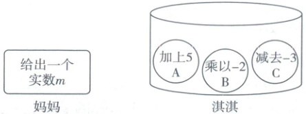如图,妈妈和淇淇做一个数学游戏,妈妈任意给出一个实数$m$,淇淇从圆桶里随机摸出小球,并按出小球的先后顺序,把实数$m$利用小球上标记的运算逐一进行计算.