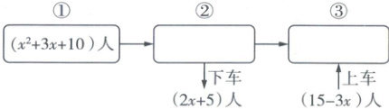 (1)$\because x^2 + 3x + 10 - (2x + 5) = x^2 + 3x + 10 - 2x - 5 = x^2 + x + 5$,$\therefore$②站的发车人数为$(x^2 + x + 5)$人。 (4分)