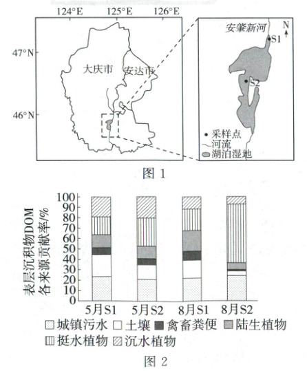 溶解态有机质(DOM)是湖泊沉积物的重要成分,组成特征受内源(水生植物)和外源(周边输入)影响。库里泡(图1)位于松嫩平原,湖区周围多耕地,其入湖河流——安肇新河是大庆市城镇生活工业纳污水体。冬春季微生物活性低,有利于腐殖化程度高的有机质积累,5月春汛时积累的有机质大部分被积雪融水带入库里泡。图2示意库里泡5月与8月入口(S1)和中心(S2)两个采样点表层沉积物DOM各来源贡献率。