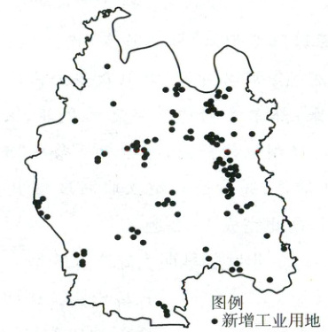 (1)依据设问要求据图描述。图中潜江市新增工业用地分布非常分散,在中部和东部局部地区出现组团集聚。
