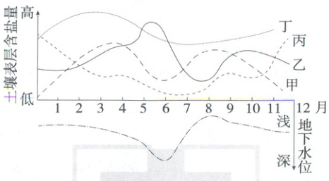 (2025安徽宿州期中)土地盐碱化是指土壤中可溶性盐分或碱性物质过度积累,导致土壤肥力下降、结构恶化,从而影响植物生长的现象。这一过程可能自然形成,也可能因人类活动加剧。华北平原是我国土地盐碱化最严重地区之一,下图为华北平原土壤表层含盐量和地下水位季节变化示意图。据此完成6—8题。