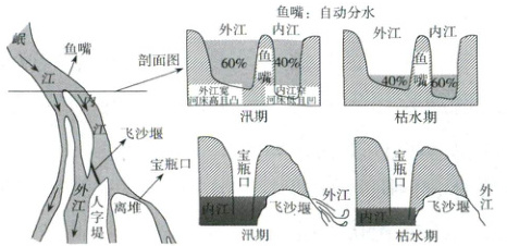 (1)读图可知,鱼嘴主要利用弯曲的河道来分流,由图中外江和内江的河床高度可知,含沙量大的底层水流向外江,以防大量泥沙淤积。枯水期内江可以满足成都平原的生产生活用水,丰水期可以起到分洪作用。