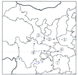 (2025安徽宿州期末)我国古代的诗人们,在广泛游历、丰富人生阅历的过程中,创作出了大量脍炙人口的诗句,为我们留下了极为珍贵的精神财富。下图展示了唐代诗人杜甫的主要游历轨迹(①至⑦分别代表省级行政单位),通过这些线索,我们可以更深入地理解他的诗歌创作背景及其内涵。据此完成9—10题。