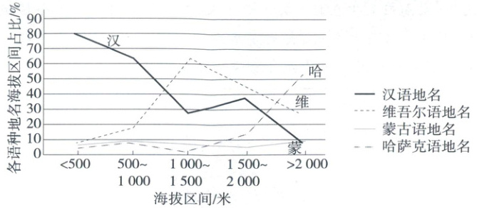 (2024山东德州期末 学科融合)新疆多语种地名的空间分布格局是新疆各民族人民长期聚居和杂居融合的映射,其形成与海拔、坡度以及当地生产方式密切相关。下图为新疆各语种地名海拔区间占比统计图,其中汉语地名数量最多,占总数的43.82%。据此完成6—8题。