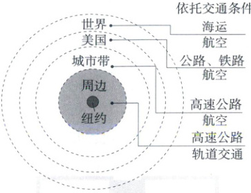 (2024四川安宁期中 回归教材)美国纽约是国际大都市的典型代表,具有综合性的城市职能,对周边地区、“波士华城市带”、美国乃至世界都有辐射带动作用。下图为纽约辐射区域及依托的交通条件示意图。据此完成6—7题。