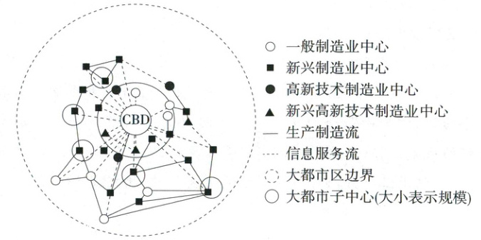 21世纪以来,上海在政策与市场共同作用下,产业结构由传统制造业主导向先进制造业和现代服务业主导快速转变,卫星城蓬勃发展,使上海大都市区呈现多中心城市空间组织结构。下图示意上海大都市区产业空间关联和组织形态。