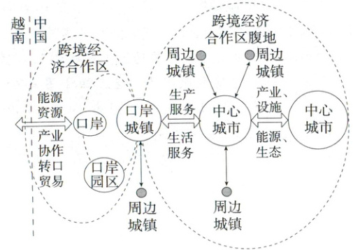 (2025广东卷)云南省河口口岸早期以货物过境贸易为主,口岸城镇功能相对单一。2007年中国河口—越南老街跨境经济合作区成立。近年来,该合作区加快推进转型升级,对口岸城镇功能及合作区腹地产生了影响。下图示意该合作区转型升级后的口岸城镇与口岸、腹地中心城市互动关系模式。据此完成15—16题。