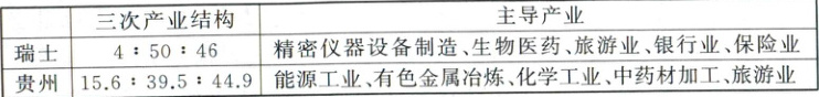 瑞士和贵州相隔万里且经济发展程度不同,但是两地在自然地理环境、交通区位等诸多方面有相似之处。近年来,贵州希望借鉴瑞士的发展经验,促进贵州产业结构的升级和优化。下表示意瑞士和贵州的产业结构。据此完成13—14题。