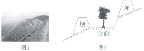 (2025 江苏镇江期末 实践探究)水平阶由坡面自上而下,每隔3~5米沿等高线修筑,阶面宽度随坡度大小和栽植树种而变,修筑的台面里低外高,一般在山石多、坡度大($10^{\circ}~25^{\circ}$)坡面上采用。图1为水平阶景观图,图2为水平阶示意图。据此完成3—5题。