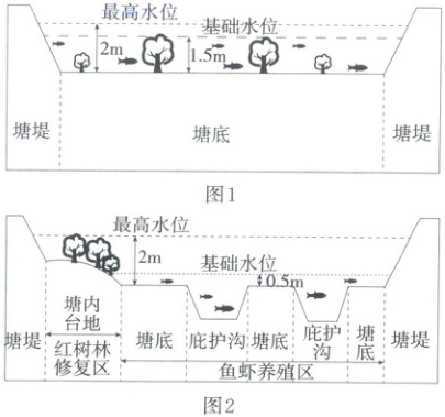 (2)降低养殖塘最低水深,有利于塘内人工种植的红树林幼苗存活;(2分)塘底开沟,有利于低水位时为鱼虾提供充分与稳定的水体以及庇护空间;(2分)堤内建台地,为红树林幼苗生长提供适宜的潮间带环境。(2分)