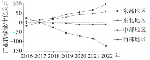 (2025浙江嘉兴期末)产业转移量是产业转入量与转出量的差值。下图为2016—2022年我国四大地区间产业转移量累加图。据此完成5—6题。