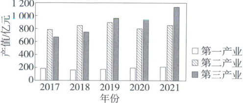 (2025成都期末)湖北省十堰市被誉为“汽车城”,其汽车工业起步于20世纪60年代。近年来,当地政府推动汽车产业高质量发展,吸引了众多新能源汽车、智能网联汽车企业集聚,同时还大力发展了旅游、健康、生态等产业。下图为十堰市2017—2021年三次产业产值变化。据此完成11—12题。