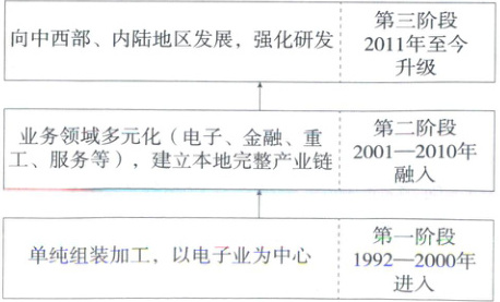 (2024河南焦作期末)韩国某公司成立于1938年,经济实力强,业务涉及电子、金融、机械、化学等众多领域,其中电子公司是其旗下最大的子公司,于1992年在中国设厂。下图示意该公司在我国的三个发展阶段。据此完成13—14题。