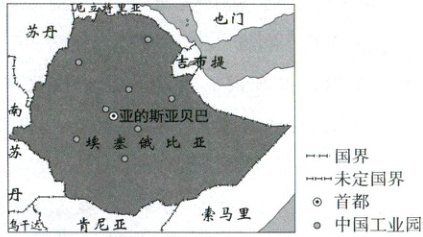 埃塞俄比亚位于非洲东北部,人口超过1.2亿。在共建“一带一路”框架下,中埃两国合作规模大、领域广。中国已成为埃塞俄比亚最大的贸易伙伴、工程承包方和投资来源国。中国企业建造的铁路、公路、工业园区、高楼大厦、绿色发展项目(如友谊广场等)以及提供的职业技能培训等,对该国经济社会产生了积极影响。目前,埃塞俄比亚不仅是非洲最具经济活力的国家之一,也是世界上增长最快的经济体之一。近年来,我国很多服装、制鞋企业到埃塞俄比亚工业园区投资建厂。如图示意埃塞俄比亚地理位置及中国工业园分布。