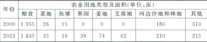(1)简述该村2000—2023年农业用地类型的变化特点。(4分)