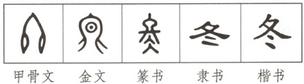 “冬”的本义是“终”,就是“终结”的意思。甲骨文中的“冬”字就像一段丝麻或者一根绳索,两头都打上结,表示两个顶端,也就是“终结”的意思。而冬季又是一年四季中最末的一个季节,所以就借用这个“冬”字来表示。