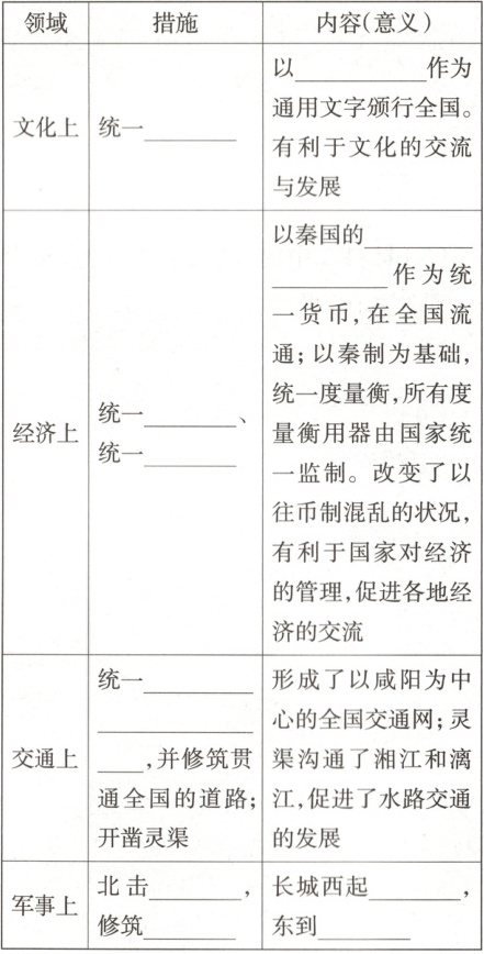 1.文字 小篆 货币 度量衡 圆形方孔半两钱 车轨和道路的宽度 匈奴 长城 临洮 辽东 2.东海 陇西 长城 南海
