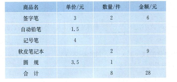 10. 小丽购买学习用品的收据如表,因污损导致部分数据无法识别,根据下表,解决下面的问题: