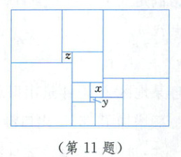11. 答案:如图,由三个小正方形边长$x$,$y$,$z$可分别表示出其余正方形边长,得:$\begin{cases}11x + 3y = 7x + 16y - z\\8x + 8y - 3z = 6x + 5y + z\end{cases}$。消去$z$得$18x = 49y$,