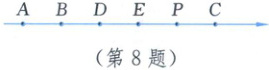 8. 如图,数轴上顺次有 $ A,B,D,E,P,C $ 六个点,且任意相邻两点之间的距离都相等,点 $ A,B,C $ 对应的数分别为 $ a,b,c $. 下列说法:① 若 $ a + b + c = 0 $,则 $ D $ 为原点;② 若 $ |c| > |a| > |b| $,则原点在 $ B,D $ 之间;③ 若 $ c - b = 8 $,则 $ a - b = -2 $;④ 若原点在 $ D,E $ 之间,则 $ |a + b| < 2c $. 其中正确的结论是(