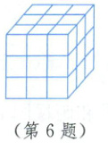 6. 如图,一个正方体由 27 个大小相同的小立方块搭成,现从中取走若干个小立方块,得到一个新的几何体。若新几何体与原正方体的表面积相等,则最多可以取走