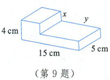 9. 如图所示,从长、宽、高分别为 15 cm,5 cm,4 cm 的长方体中切割走一块长、宽、高分别为$y$ cm,5 cm,$x$ cm 的长方体($x$,$y$为整数),余下部分的体积为$120 cm³$,那么$x$为