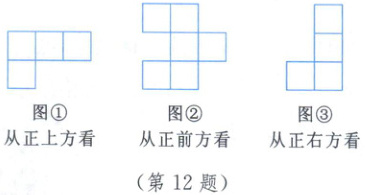 12. 一个几何体是由若干个相同的小立方体粘贴而成的,粘贴处是两个小立方体的两个面,分别从这个几何体的正上方、正前方、正右方看它,得到如下的三个平面图形。设小立方体的棱长是 1,求这个几何体的表面积。