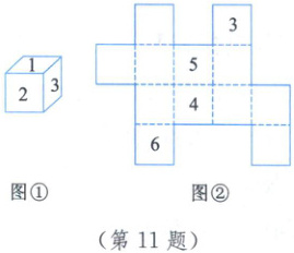 11. 孪生兄弟 有 2 个与图①完全相同的正方体,其相对两面上的数字和都等于 7。请你将图②的网格图形用折线分成 2 部分,使其正好是 2 个如图①的正方体的表面展开图,并在 8 个空格中补写出相应的数字。