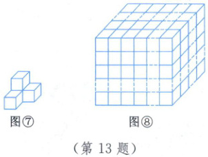 如图,图⑦是一个由 4 个棱长为 1 的小立方体构成的几何体,图⑧是一个长、宽、高分别为$a$,$b$,$c$($a≥2$,$b≥2$,$c≥2$,且$a$,$b$,$c$是正整数)的长方体,被分成了$a×b×c$个棱长为 1 的小立方体。在图⑧的不同位置共可以找到