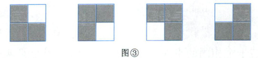 如图③,对于$2×2$的方格纸,要用图①盖住其中的三个小正方形,显然有 4 种不同的放置方法。